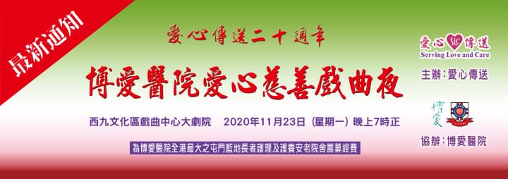 愛心傳送二十周年 – 博愛醫院愛心慈善戲曲夜」將於2020年11月23日(星期一)假西九文化區戲曲中心大劇院舉行,因應政府政策規定,所有現場表演的公眾娛樂活動,只容納座位數目之一半現場觀眾,以確保社交距離。因此,表演場地當天只開放一半座位,並將實施特別座位安排。表演場次將分日/夜兩場,日場時間為下午 2:15,夜場時間為下午7:15。觀眾請保留2020年2月28日之舊有門票,並於2020年11月10日前致電6257-5500 「愛心傳送」陳小姐,或本院企業傳訊及籌募部2479-0121,以便辦理登記手續及更換門票。
