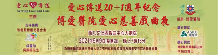 由「愛心傳送」主辦、博愛醫院協辦之《愛心傳送二十一周年 – 博愛醫院愛心慈善戲曲夜》將於2021年9月9日(星期四)晚上7時15分假西九文化區戲曲中心大劇院舉行,目的為博愛醫院興建全港最大型之屯門藍地長者護理及護養安老院舍籌募經費。