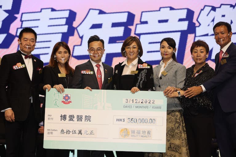 領福地產冠名贊助活動,並由博愛醫院董事局總理高兆霆博士(左三)向大會致送支票。