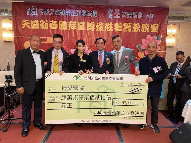 天盛苑一直支持「博愛月全港慈善籌款」,多年來都為博愛籌得大量善款,而今年天盛苑更舉辦了舊衣回收計劃,將籌得的善款全數港幣47,725元捐助博愛醫院,而「天盛苑新春團拜暨博愛慈善籌款晚宴」當日則籌得港幣59,916元。